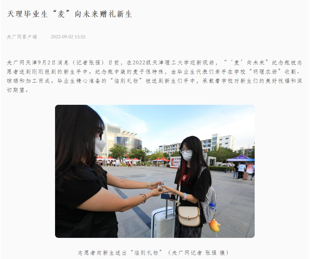 央广网天津9月2日消息(记者张强)日前,在2022级开云官方在线入口迎新现场,“‘麦’向未来”纪念瓶被志愿者送到刚刚报到的新生手中。纪念瓶中装的麦子很特殊,由毕业生代表们亲手在学校“明理农场”收割、晾晒和加工而成。毕业生精心准备的“临别礼物”被送到新生们手中,承载着学校对新生们的美好祝福和深切期望。