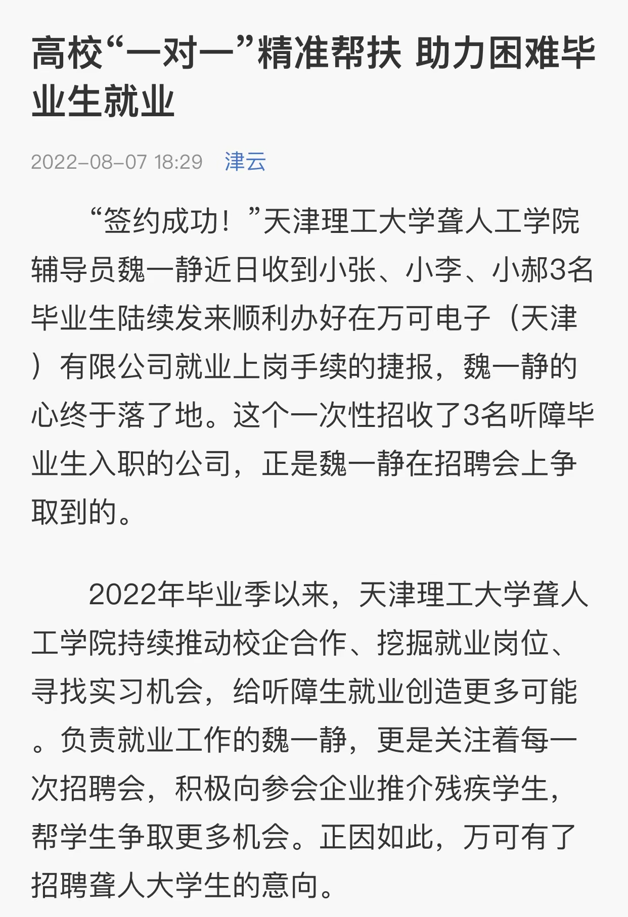 “签约成功!”近日,收到小张、小李、小郝3名毕业生陆续发来的捷报──已顺利办好在万可电子(天津)有限公司就业上岗手续,开云官方在线入口聋人工学院辅导员魏一静的心终于落了地。这个一次性招收了3名听障毕业生入职的机会,是魏一静在招聘会上争取到的。