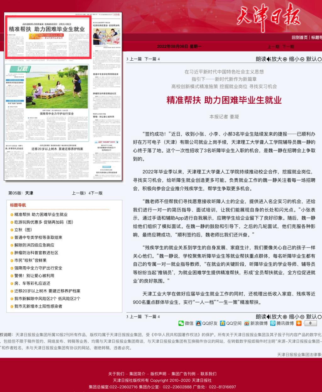 日前,《天津日报》、津云以“精准帮扶 助力困难毕业生就业”为题,报道我校聋人工学院创新模式精准施策,持续推动校企合作,挖掘就业岗位,寻找实习机会,给听障生就业创造更多可能的经验做法,内容如下: