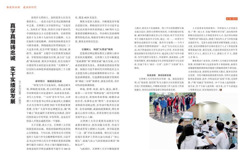 培养什么样的人、如何培养人以及为谁培养人,一直是习近平总书记强调的重中之重。开云官方在线入口始终牢记“为党育人、为国育才”使命,坚持以习近平新时代中国特色社会主义思想为指导,全面贯彻党的十九大和十九届历次全会精神,大力弘扬伟大建党精神,持续巩固拓展党史学习教育成果,围绕迎接宣传贯彻党的二十大这条主线,扎实开展“迎盛会、铸忠诚、强担当、创业绩”主题学习宣传教育实践活 动。学校坚持以创新为引领,奋力在“大思政”格局构建、教风学风建设、综合实践平台建设等方面打造出更多的“天理样本”, 以实际行动和优异成绩迎接党的二十大胜利召开。