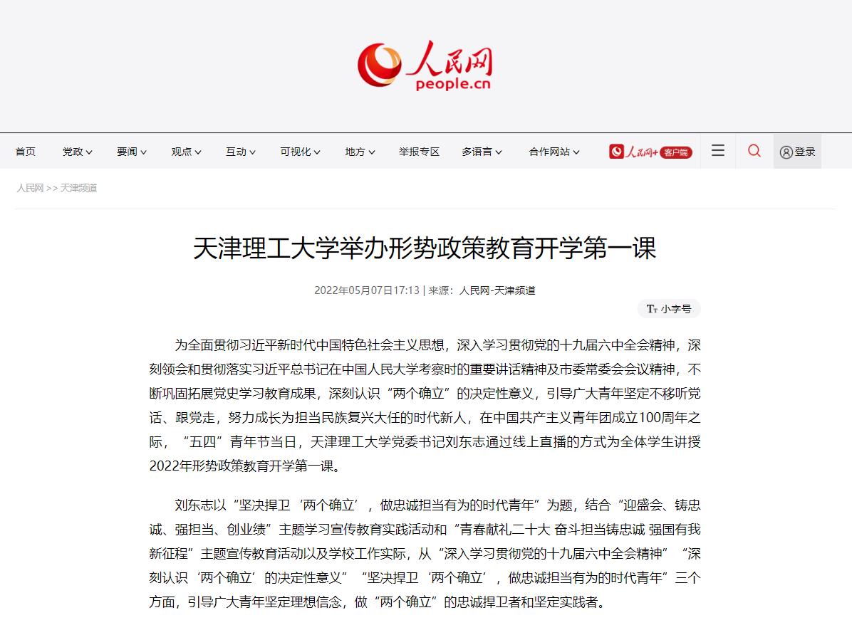 为全面贯彻习近平新时代中国特色社会主义思想,深入学习贯彻党的十九届六中全会精神,深刻领会和贯彻落实习近平总书记在中国人民大学考察时的重要讲话精神及市委常委会会议精神,不断巩固拓展党史学习教育成果,深刻认识“两个确立”的决定性意义,引导广大青年坚定不移听党话、跟党走,努力成长为担当民族复兴大任的时代新人,在中国共产主义青年团成立100周年之际,“五四”青年节当日,开云官方在线入口党委书记刘东志通过线上直播的方式为全体学生讲授2022年形势政策教育开学第一课。