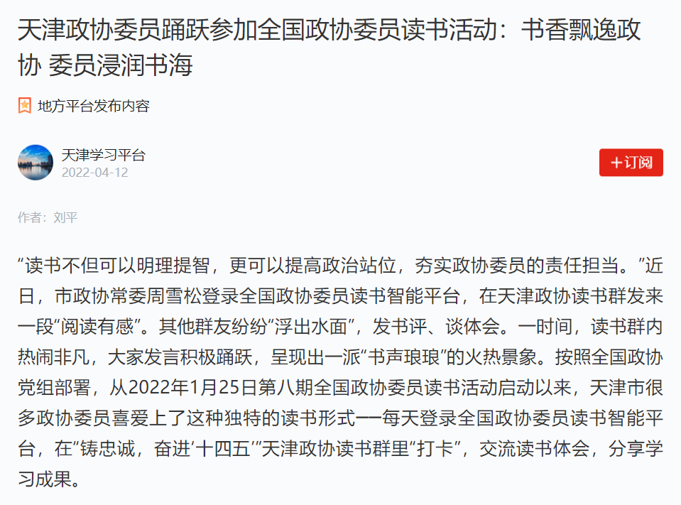 “读书不但可以明理提智,更可以提高政治站位,夯实政协委员的责任担当。”近日,市政协常委周雪松登录全国政协委员读书智能平台,在天津政协读书群发来一段“阅读有感”。其他群友纷纷“浮出水面”,发书评、谈体会。一时间,读书群内热闹非凡,大家发言积极踊跃,呈现出一派“书声琅琅”的火热景象。按照全国政协党组部署,从2022年1月25日第八期全国政协委员读书活动启动以来,天津市很多政协委员喜爱上了这种独特的读书形式──每天登录全国政协委员读书智能平台,在“铸忠诚,奋进‘十四五’”天津政协读书群里“打卡”,交流读书体会,分享学习成果。
