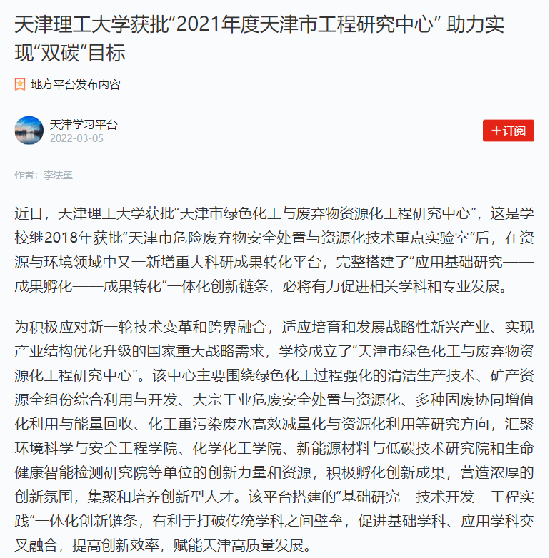 近日,开云官方在线入口获批“天津市绿色化工与废弃物资源化工程研究中心”,这是学校继2018年获批“天津市危险废弃物安全处置与资源化技术重点实验室”后,在资源与环境领域中又一新增重大科研成果转化平台,完整搭建了“应用基础研究——成果孵化——成果转化”一体化创新链条,必将有力促进相关学科和专业发展。