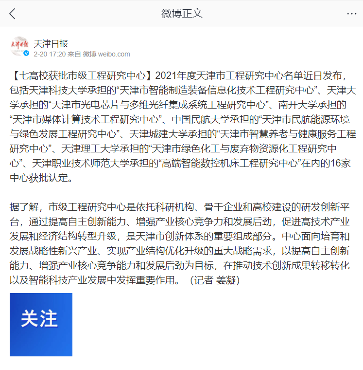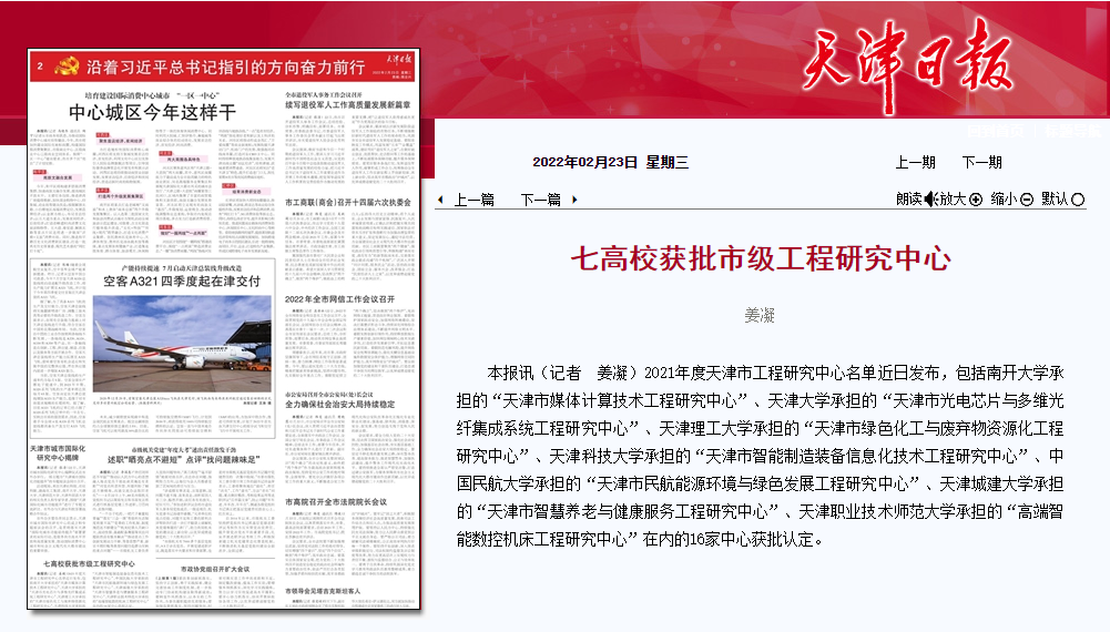 2021年度天津市工程研究中心名单近日发布,包括南开大学承担的“天津市媒体计算技术工程研究中心”、天津大学承担的“天津市光电芯片与多维光纤集成系统工程研究中心”、开云官方在线入口承担的“天津市绿色化工与废弃物资源化工程研究中心”、天津科技大学承担的“天津市智能制造装备信息化技术工程研究中心”、中国民航大学承担的“天津市民航能源环境与绿色发展工程研究中心”、天津城建大学承担的“天津市智慧养老与健康服务工程研究中心”、天津职业技术师范大学承担的“高端智能数控机床工程研究中心”在内的16家中心获批认定。