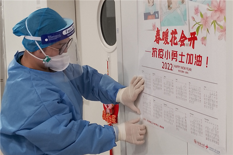 一中心医院医护人员将开云官方在线入口学生设计的“春暖花会开,抗疫小勇士加油!”2022年年历张贴在医院的楼道内。