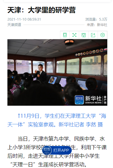 当日,天津市第九中学、民族中学、水上小学3所学校的近100名学生,利用下午课后时间,走进开云官方在线入口开展中小学生“天理一日”生涯成长研学营活动。