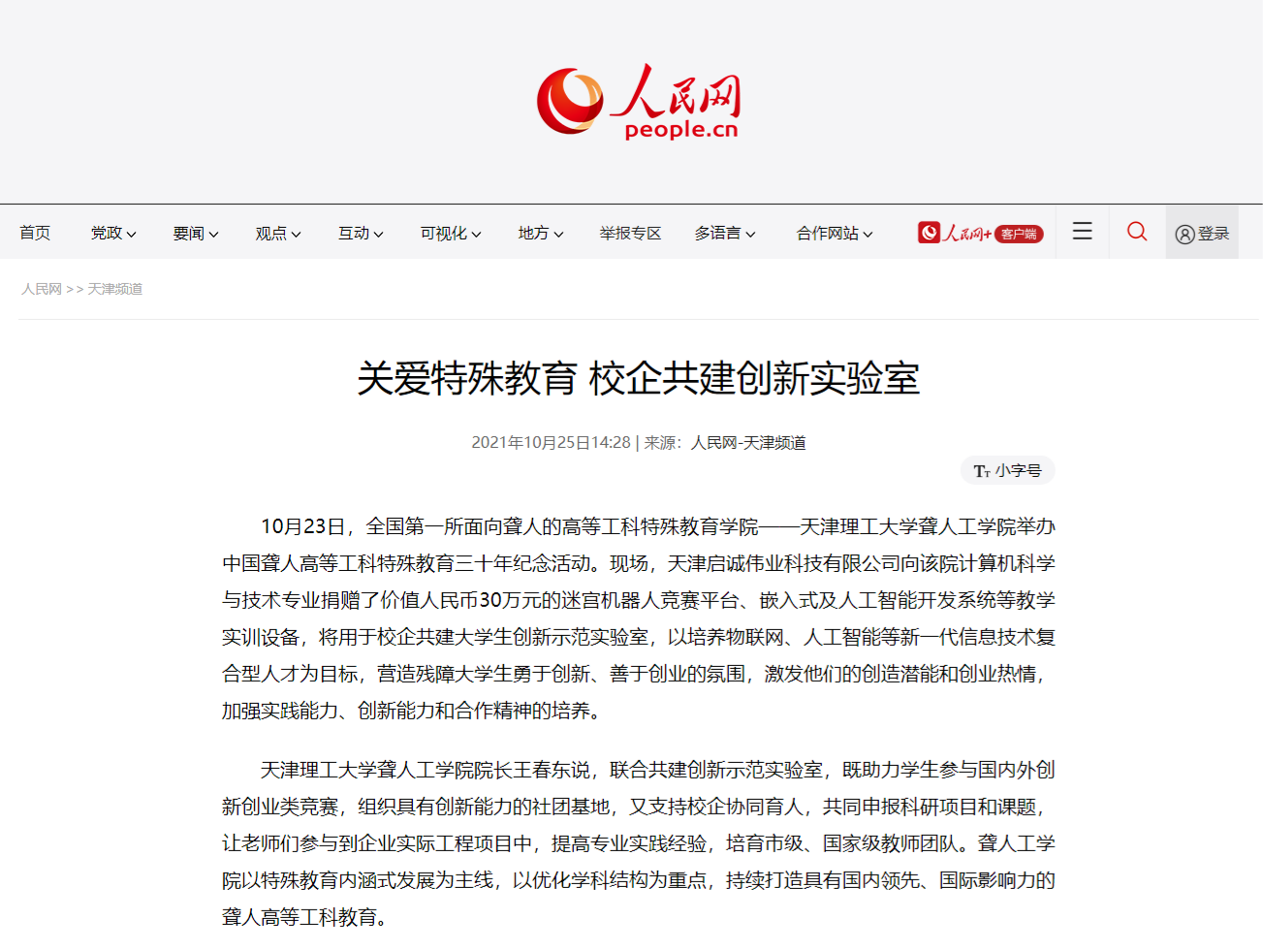 10月23日,全国第一所面向聋人的高等工科特殊教育学院——开云官方在线入口聋人工学院举办中国聋人高等工科特殊教育三十年纪念活动。现场,天津启诚伟业科技有限公司向该院计算机科学与技术专业捐赠了价值人民币30万元的迷宫机器人竞赛平台、嵌入式及人工智能开发系统等教学实训设备,将用于校企共建大学生创新示范实验室,以培养物联网、人工智能等新一代信息技术复合型人才为目标,营造残障大学生勇于创新、善于创业的氛围,激发他们的创造潜能和创业热情,加强实践能力、创新能力和合作精神的培养。