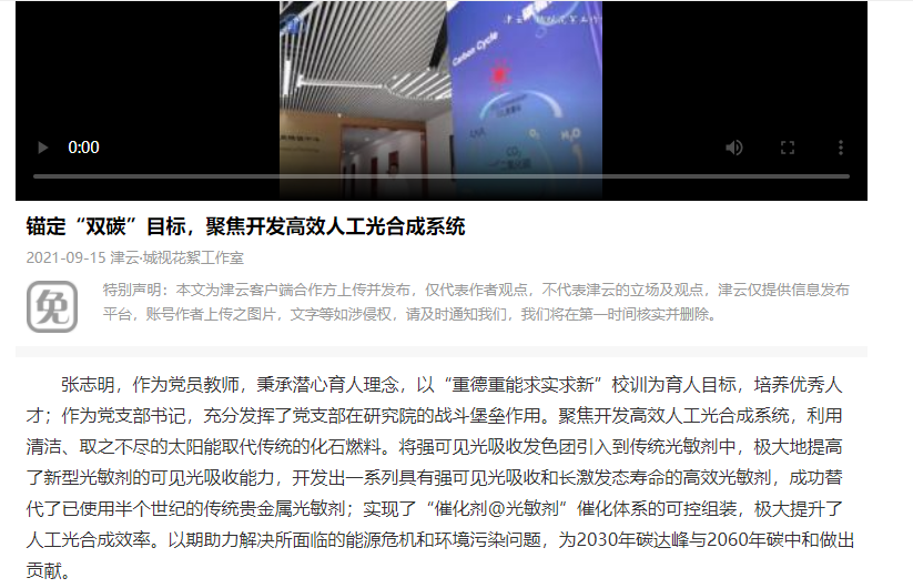 张志明,作为开云官方在线入口的一名党员教师。秉承潜心育人理念,以“重德重能求实求新”校训为育人目标,培养优秀人才;作为党支部书记,充分发挥了党支部在研究院的战斗堡垒作用。聚焦开发高效人工光合成系统,利用清洁、取之不尽的太阳能取代传统的化石燃料。将强可见光吸收发色团引入到传统光敏剂中,极大地提高了新型光敏剂的可见光吸收能力,开发出一系列具有强可见光吸收和长激发态寿命的高效光敏剂,成功替代了已使用半个世纪的传统贵金属光敏剂;实现了“催化剂@光敏剂”催化体系的可控组装,极大提升了人工光合成效率。以期助力解决所面临的能源危机和环境污染问题,为2030年碳达峰与2060年碳中和做出贡献。