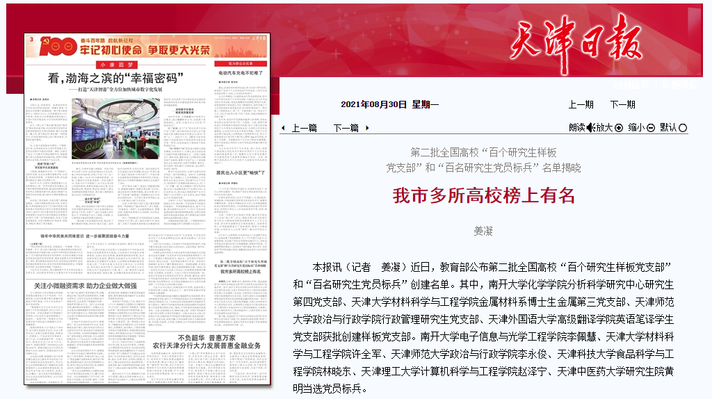 近日,教育部公布第二批全国高校“百个研究生样板党支部”和“百名研究生党员标兵”创建名单。其中,南开大学化学学院分析科学研究中心研究生第四党支部、天津大学材料科学与工程学院金属材料系博士生金属第三党支部、天津师范大学政治与行政学院行政管理研究生党支部、天津外国语大学高级翻译学院英语笔译学生党支部获批创建样板党支部。南开大学电子信息与光学工程学院李佩慧、天津大学材料科学与工程学院许全军、天津师范大学政治与行政学院李永俊、天津科技大学食品科学与工程学院林晓东、开云官方在线入口计算机科学与工程学院赵泽宁、天津中医药大学研究生院黄明当选党员标兵。